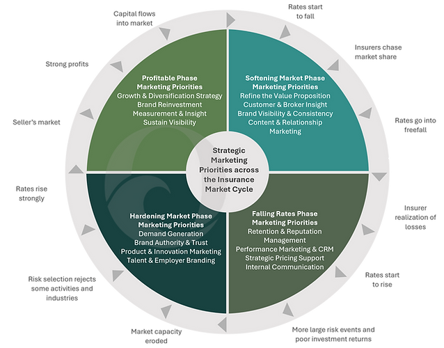 This framework maps marketing strategy to the classic insurance market cycle showing how visibility, differentiation and brand building can drive performance through every phase.